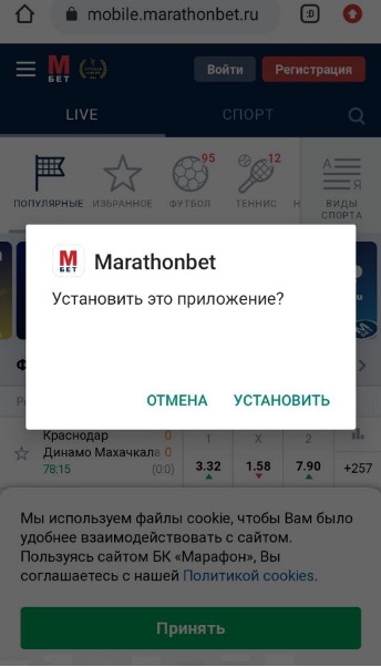 Откройте на своём устройстве мобильную версию сайта БК «Марафон» и в верхней части нажмите кнопку «Скачать». После того, как файл загрузится, кликните «Открыть» и далее «Установить».