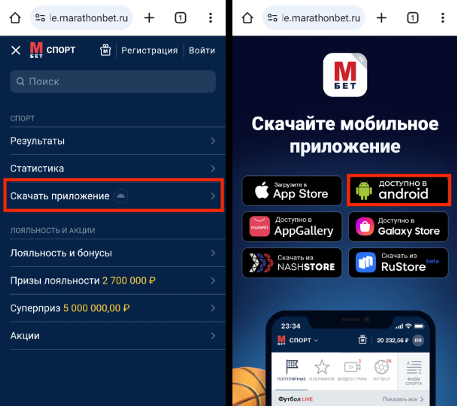 Чтобы скачать версию для Android перейдите на официальный сайт БК «Марафон» с мобильного устройства. Далее зайдите в главное меню, выберите пункт «Скачать приложение», затем нажмите «Доступно в Android». Загрузка файла начнется автоматически.
